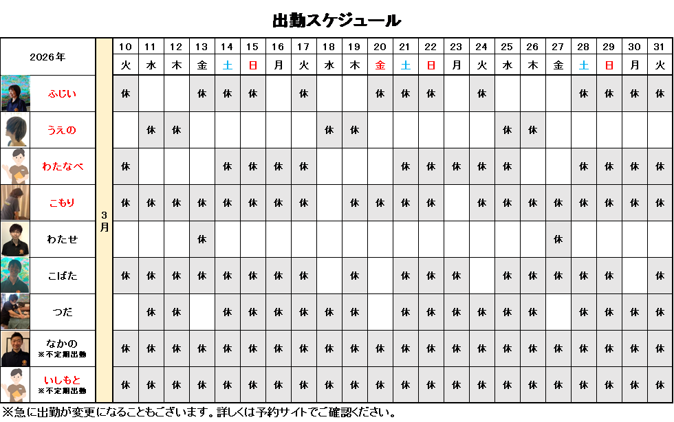 3月後半、出勤スケジュール